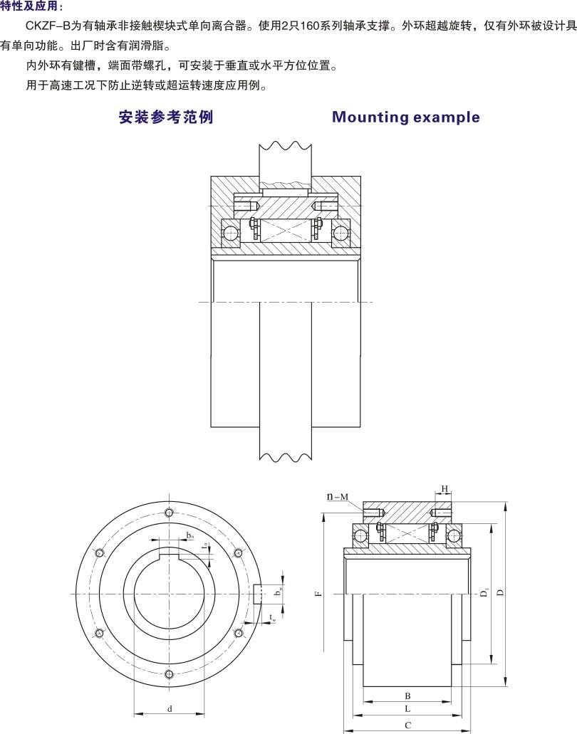 CKZF-B為有軸承非接觸式單向離合器。使用2只160系列軸承支撐。外環超越旋轉,僅有外環被設計具有單向功能。出廠時含有潤滑脂。