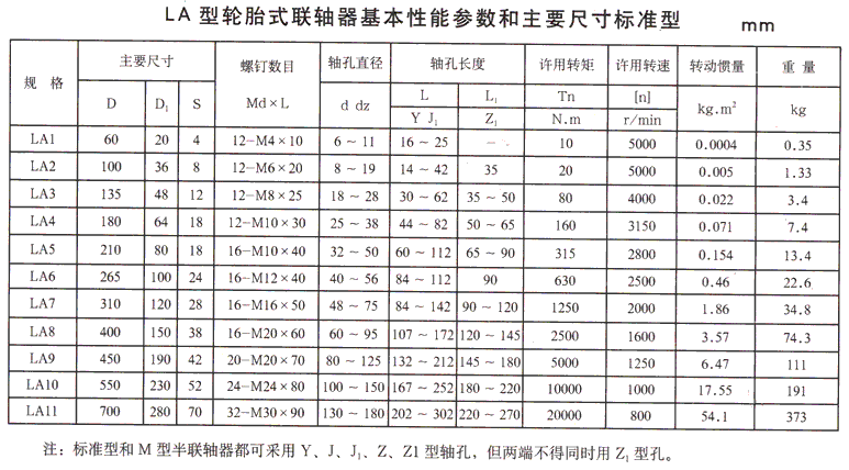 LLA型冶金設備用輪胎式聯軸器基本性能參數和主要尺寸