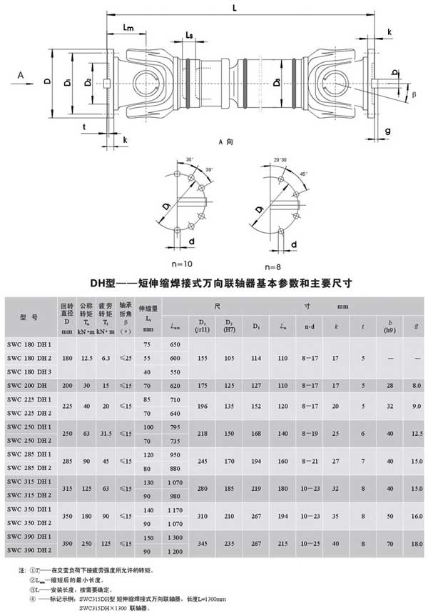 SWC-DH型短伸縮焊接式萬向聯軸器的共同特點是角向補償量較大,不同結構型式萬向聯軸器兩軸線夾角不相同,一般≤5°-45°之間。萬向聯軸器利用其機構的特點,使兩軸不在同一軸線,存
